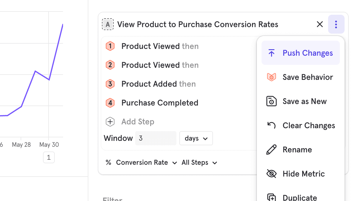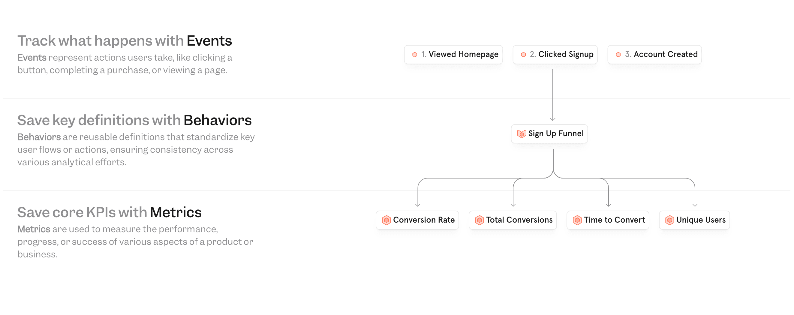 Simplify updates: Centralize definition management. If a specific user behavior or flow changes (e.g. your “Signup Flow” removes a step), you only need to update the saved behavior definition once. All saved metrics that rely on that behavior (e.g. “Signup Flow Time to Convert,” “Signup Flow Conversion Rate,” “Signup Flow Unique Users”) will automatically reflect the updated Signup Flow definition.