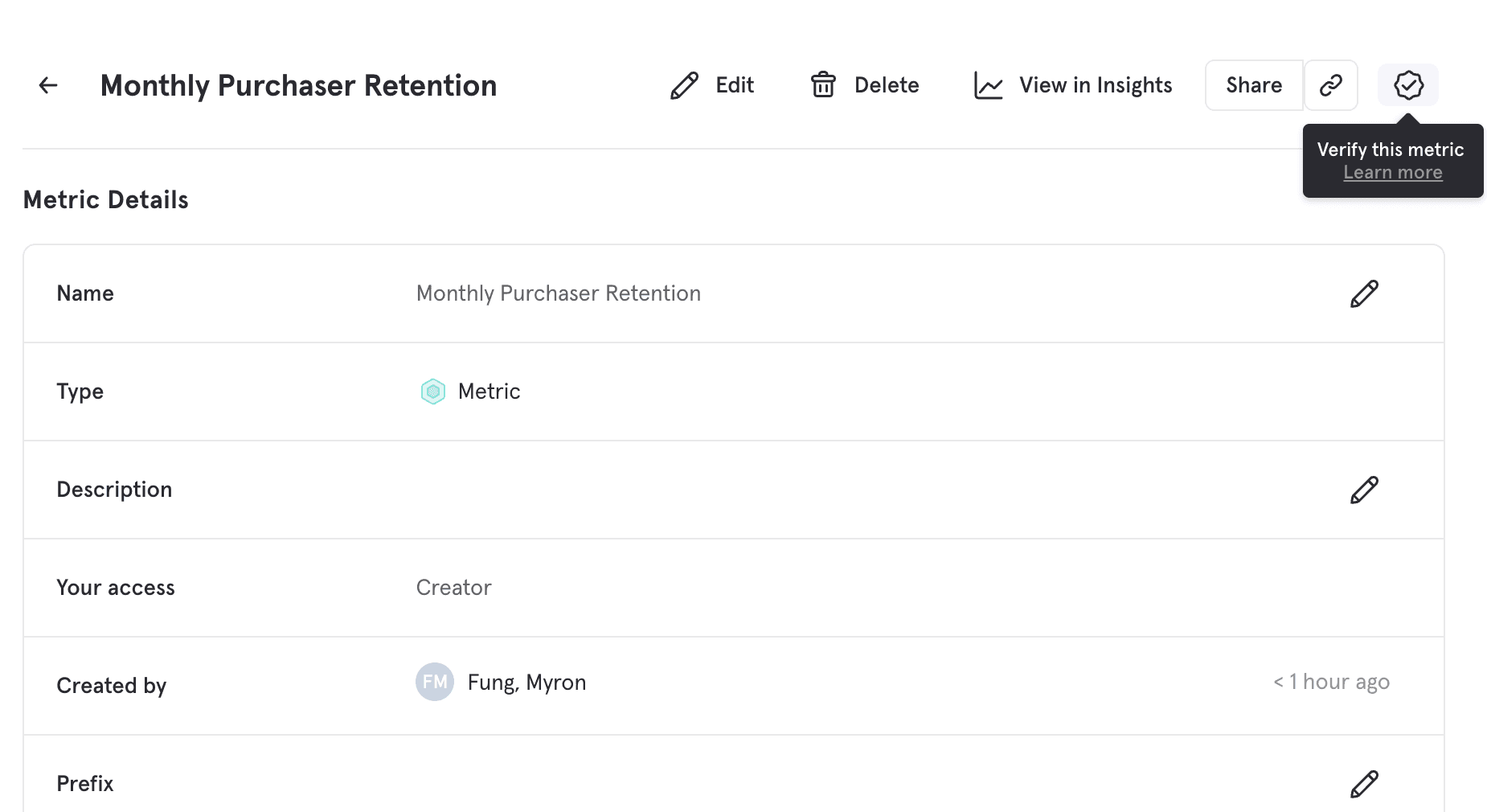 - Verify: Add Verified badges to the metric/behavior. Only project Admins and Owners can verify entities in the Lexicon.